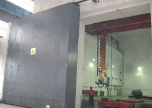 工業探傷門門體中心設有旋轉軸和驅動機構,運動方式為繞門體中心軸旋轉90°后進行開啟或關閉。驅動機構一般裝在門體上方或下方。工業探傷門主要由門板、行走機構、限位裝置、把手、導軌及緩沖止擋器等組成。如需動力驅動,一般采用電機驅動,與起重機大車行走機構類似。